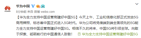 荔枝新闻讯 华为发布公告称,今天上午,工业和信息化部正式发放5G商用牌照,标志着中国正式进入5G时代。华为公司将凭借端到端全面领先的5G能力全力支持中国运营商建好中国5G。相信不久的将来,中国5G将引领全球。向敢于探索、砥砺前行的中国通信人致敬!