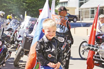图为活动现场,一位俄罗斯男孩正在迎接参加活动的车手。
