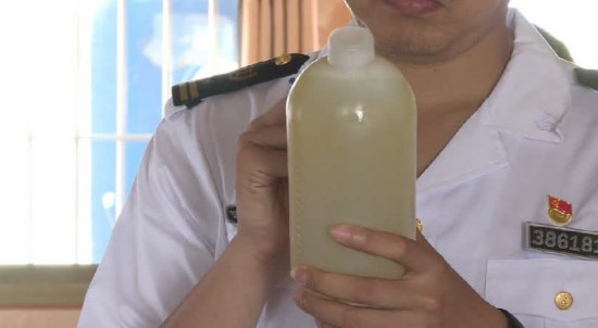 在苏州华能热电公司码头,海事执法人员进入一艘停泊货船的船舱,从油箱中抽取了1升柴油,当场进行快速检测。记者看到,样品柴油放到检测仪后,经过仪器180秒分析,当场就能得到结果。
