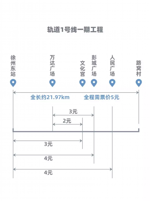 轨道1号线一期工程从路窝村站到徐州东站,全长约21.97km,全程需票价5元;从徐州东站到文化宫为3元,到彭城广场、人民广场均为4元;从万达广场到文化宫2元,彭城广场3元。