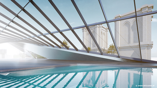 Who Cares设计公司的方案是在巴黎圣母院屋顶建造一座屋顶花园,虽然和Miysis工作室的想法类似,但Who Cares的方案中包含更多露天空间,结合了开放式花园、室内空间和游泳池。