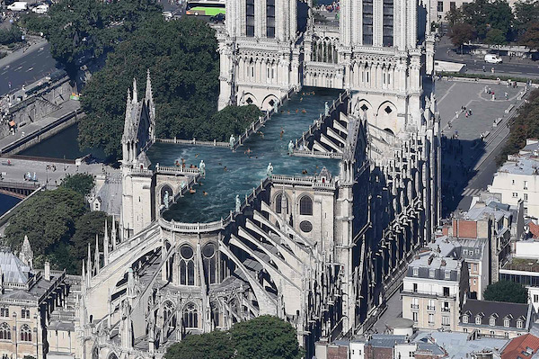 公司想要在屋顶开辟一处可供大家放松的公共空间,在体验巴黎圣母院的历史的同时,也能享受到巴黎的好风景。那12座幸运逃过大火的使徒像,正好可以守护着这座巨大的游泳池。