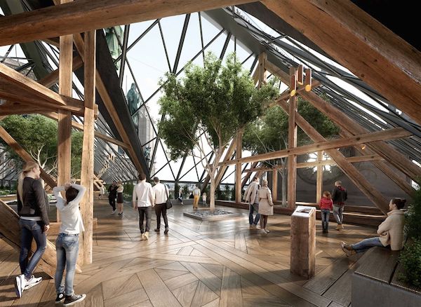 橡木框架上将覆盖立体水晶玻璃,为屋顶内的空间引入光线。玻璃材料由碳、氢、氮和氧组成,它吸收光线并将其转化为电能,并储存在氢燃料电池中,整个大教堂都可以使用此能源。屋顶内部还将建造一处农场,主要用来种植水果和蔬菜,采用有机方式种植,计划产量可以达到每年每平方米25公斤。