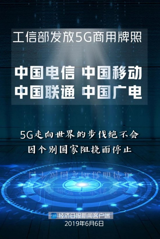 6月6日,工信部向中国电信、中国移动、中国联通、中国广播电视网络有限公司等正式发放了4张5G商用牌照,中国信息通信研究院副院长、IMT-2020(5G)推进组组长王志勤表示,5G商用牌照的发放标志着我国正式进入5G商用元年 。