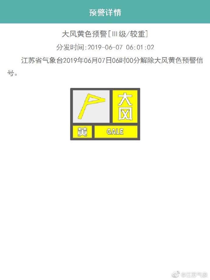 据江苏省气象台,今早(6月7日)6时00分,我省解除大风黄色预警信号。