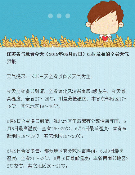 未来三天全省以多云天气为主,今天(7日)全省多云到晴,全省偏北风转东南风3级左右,今天最高温度:全省27~28℃,明晨最低温度:本省东部地区17~18℃,其它地区19~20℃。