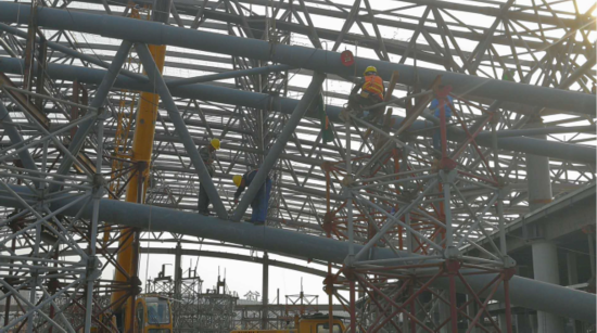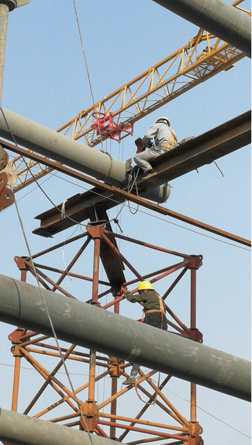6月4号,高铁东站房高架候车厅,上部钢结构焊接、拼装工程施工正在紧张进行。中铁十二局施工人员徐高峰和工友一起站在高高的桁架上,挥汗如雨,焊接钢结构梁架。他向无线徐州全媒体记者介绍说,桁架上钢管被太阳晒后,温度达到50、60℃,在上面操作的时候,本身焊接温度很高,太阳又晒,防护服很厚,还是非常辛苦的。