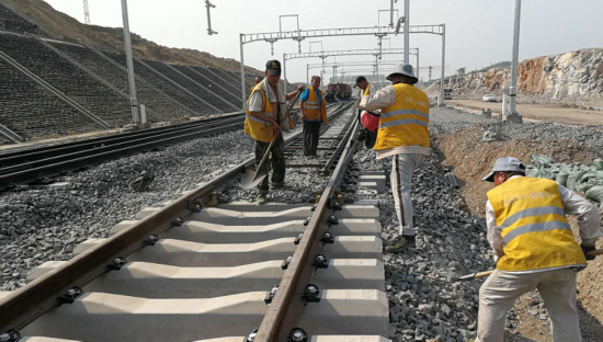 与此同时,向南500米左右的徐宿淮盐铁路进站通道上,路轨道岔基础施工正在紧张进行。中铁十一局施工人员李宪亭手持振动式小蜜蜂捣固机,头顶烈日,每天工作十个小时,将每一寸道砟细细地捣实。