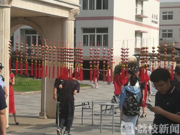 雨花台中学考点门口,学校大门上挂着不少小粽子饰品,考生从下面进入考场。寓意“高粽”。