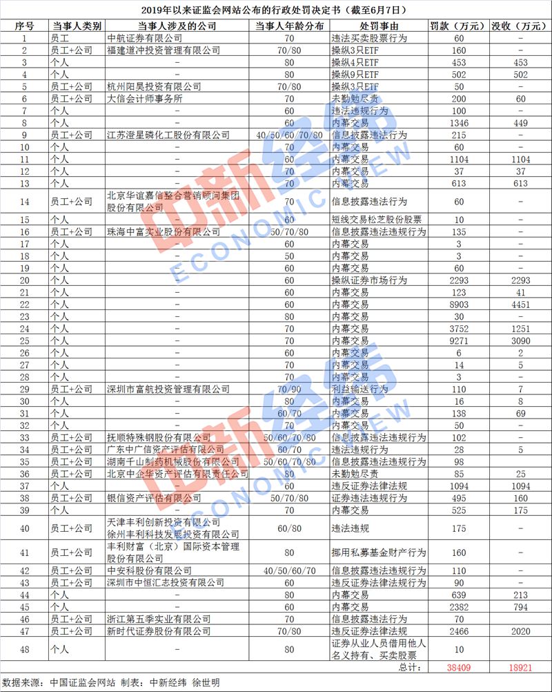 中新经纬客户端6月8日电 (徐世明)2019年以来,证监会网站已公布48份行政处罚决定书,共罚没5.73亿元。