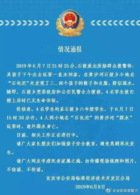 经核查,4名学生均系石鼓乡六年级学生,于6月7日15时30分许,4人到小地名“石包沱”的黄沙河“踩水”玩耍时,意外溺水身亡。目前,相关工作正在进行中。请广大家长朋友们加强孩子安全教育,避免悲剧再次发生。