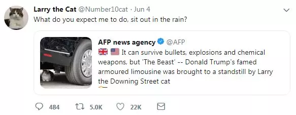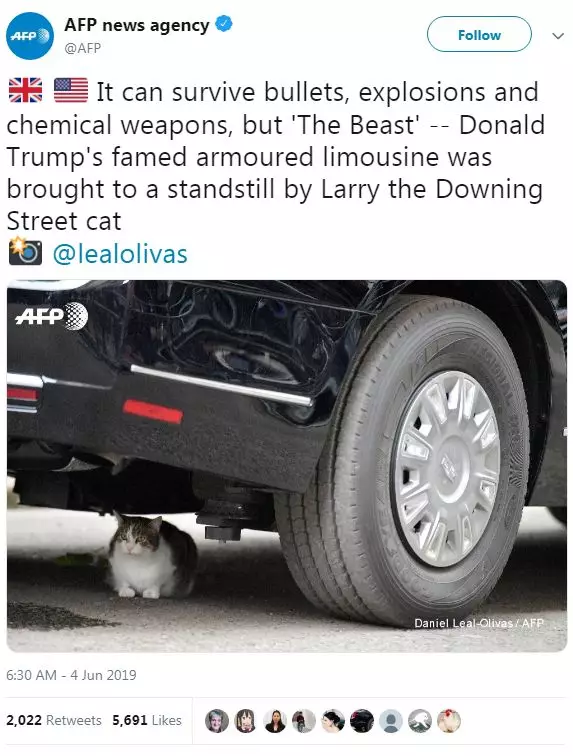 据法新社报道,在特朗普前往唐宁街10号与英国首相会晤时,英国首相的“首席捕鼠官”小猫咪拉里(Larry)对特朗普的安全造成了“威胁”。