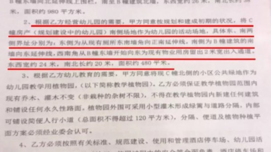 但小区业委会主任杨桂兰说,由于幼儿园的装修破坏了小区部分设施,违背了协议约定,目前,小区业委会已经不认可这份协议。