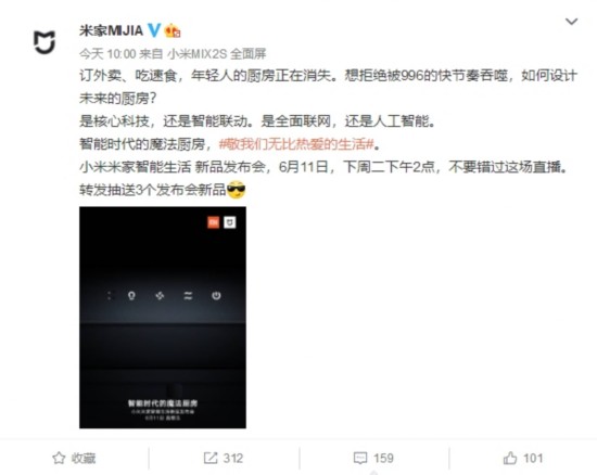 米家官微发文称:“订外卖、吃速食,年轻人的厨房正在消失。想拒绝被996的快节奏吞噬,如何设计未来的厨房?是核心科技,还是智能联动。是全面联网,还是人工智能。智能时代的魔法厨房,#敬我们无比热爱的生活#。小米米家智能生活新品发布会,6月11日,下周二下午2点,不要错过这场直播。”