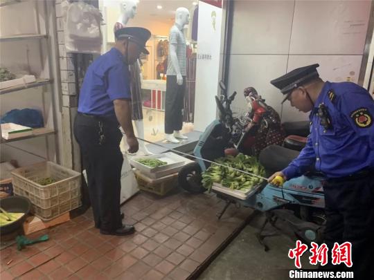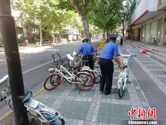 执法人员检查共享单车乱停乱放。张煜欢 摄