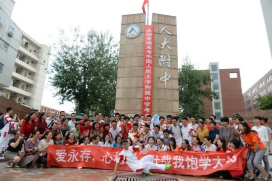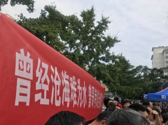 “曾经沧海难为水,曾哥考试全都对!!!”,在人大附中考点校迎接考生的队伍中,几位学生拉的一条大红横幅格外显眼,专为他们的“曾哥”加油。据拉横幅的一位学生介绍,他们是十一学校的毕业生,为自己曾经的同班同学“曾哥”加油,曾同学由于目标远大,选择了复读,今年再赴考场。