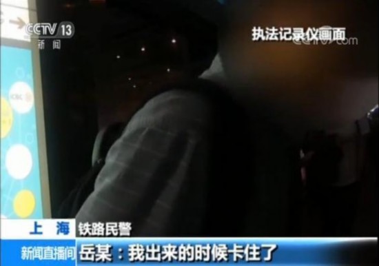 监控显示,5月26日,视频中的岳某在虹桥火车站出站口尾随其他乘客逃票出站被执勤民警当场抓获。不过岳某百般抵赖自己没有逃票。