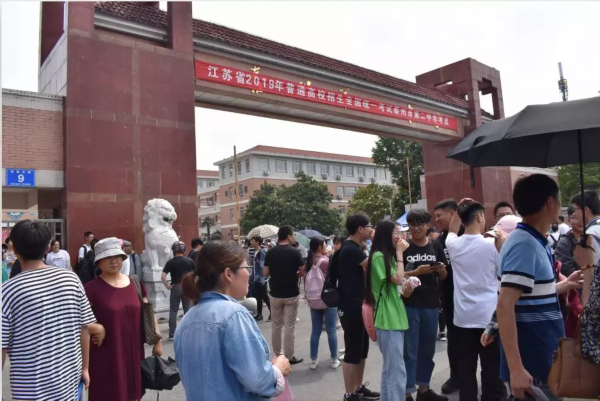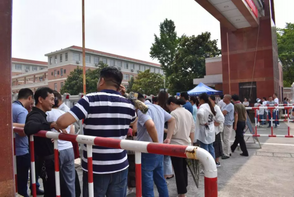 在泰州市第二中学考点前,许多考生身边都有家长陪伴在身边。进考场前,家长们仔细叮嘱,希望孩子放松心态,安心考试。
