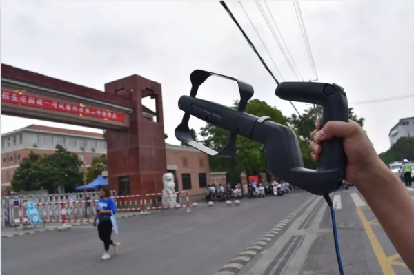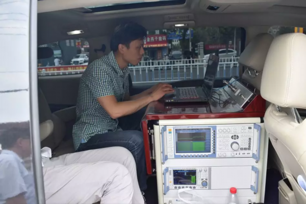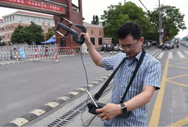 在泰州市第二中学考点,工作人员依托车载式监测设备,对学校周边的无线电信号进行分析、监测。