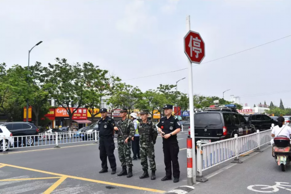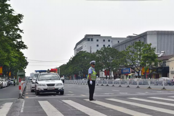 在泰州二中和机电高职考点,交警对迎春路实施交通管制。14:50至15:30,在听力考试及考试的前后十分钟期间,考点附近所有车辆包括机动车和电瓶车都禁止通行。考点附近每隔五十米,就有一位交警在执勤。