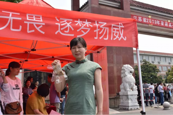 特地穿着绿色旗袍的妈妈,拿着粽子,希望孩子考试解题过程中“一路绿灯,一举高中”。