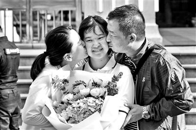 陈经纶中学考点外,爸爸妈妈手持鲜花迎接女儿