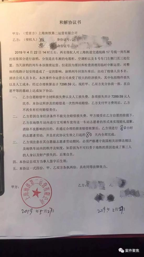 其实,这事的确还没完,经过核算,清理涂鸦的人工成本和材料成本等共计七千余元,地铁运营公司需要两人进行赔偿。