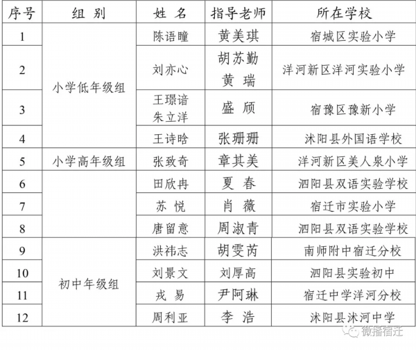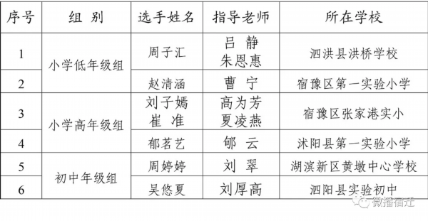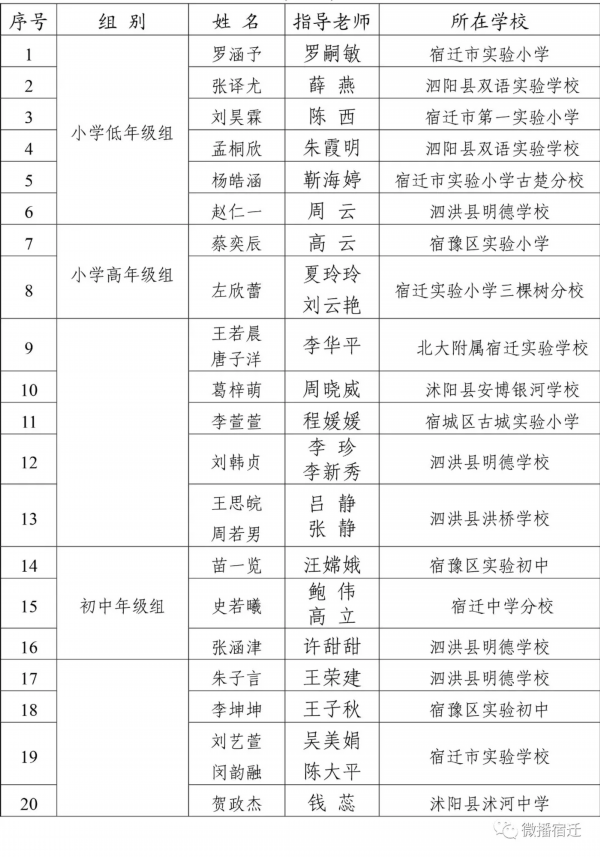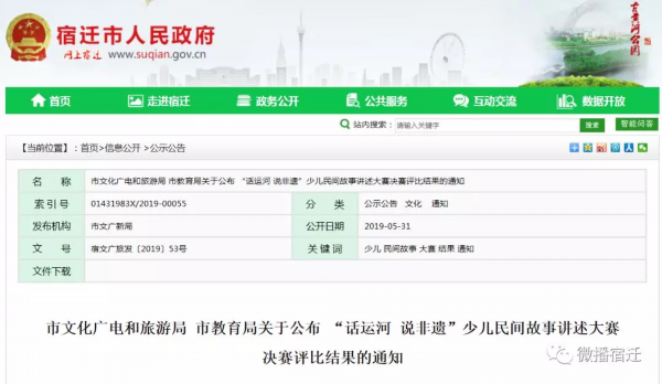 日前,市文化广电和旅游局、教育局公布 了“话运河 说非遗”少儿民间故事讲述大赛决赛评比结果,经评委专家现场打分,评出一等奖6名、二等奖12名、三等奖20名;沭阳县文化广电和旅游局、沭阳县教育局等6家单位获优秀组织奖,张珊珊等44位老师获“优秀指导老师”称号。
