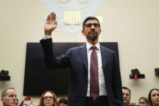 谷歌首席执行官桑达尔皮查伊(Sundar Pichai)于2018年12月11日在美国华盛顿举行的众议院司法委员会听证会上宣誓