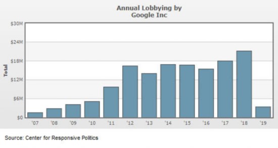 Center for Responsive Politics统计的数据显示,在2018年,谷歌在游说方面的花费高达2170万美元。连续两年,谷歌始终是最大的企业游说开支大户,超过了波音和AT&T等传统领先者。亚马逊和Facebook的游说开支也在2018年达到了创纪录水平。
