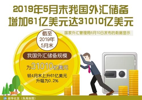 国家外汇管理局6月10日公布的最新外汇储备规模数据显示,截至2019年5月末,我国外汇储备规模为31010亿美元,较4月末上升61亿美元,升幅为0.2%。5月份外储规模重新站上了3.1万亿美元关口。