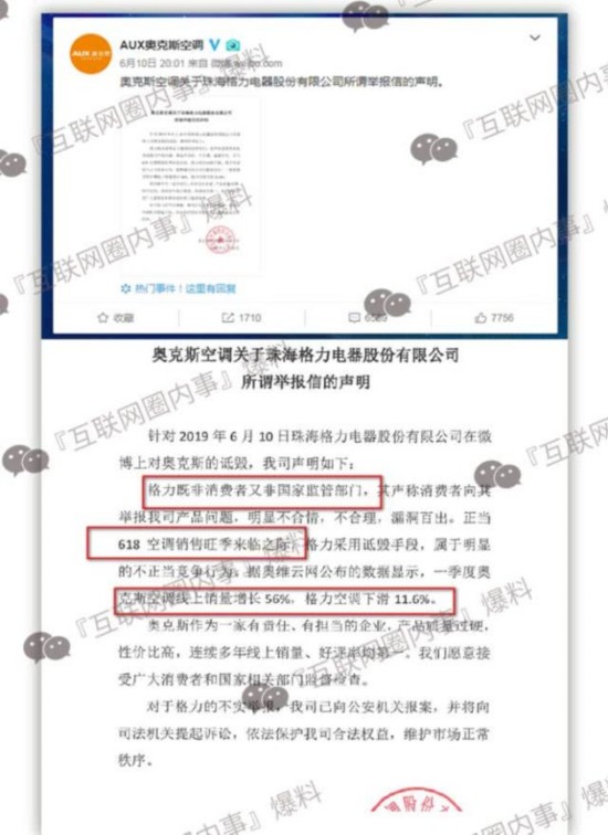 6月10日下午,格力电器官方微博一则关天奥克斯空调产品不合格的举报信,成为一场“大战”的导火索。随后,格力与奥克斯便开始了你来我往的“互怼”,言辞激烈,互不退让。