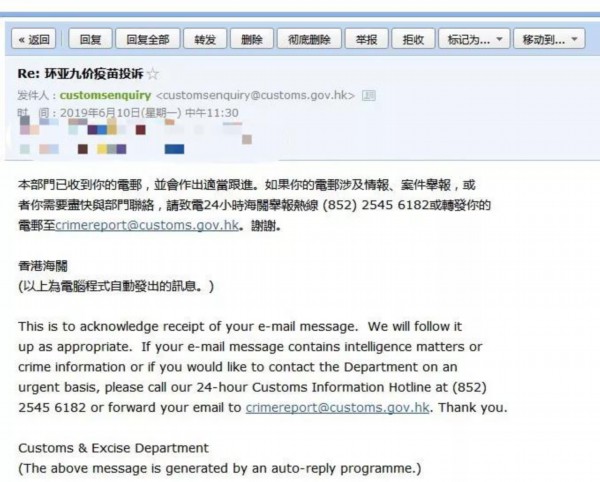 香港卫生署新闻及公共关系组在5月6日表示,卫生署已就投诉人所提供的资料作出调查,如发现违法情况会采取执法行动。根据《进出口条例》(第60章)规定,从香港境外进口药剂制品的人士,必须事先申领由工业贸易署署长授权卫生署所签发的进口许可证。如有人违反规定从境外进口药剂制品,一经定罪,可被罚款50万港元及监禁两年。