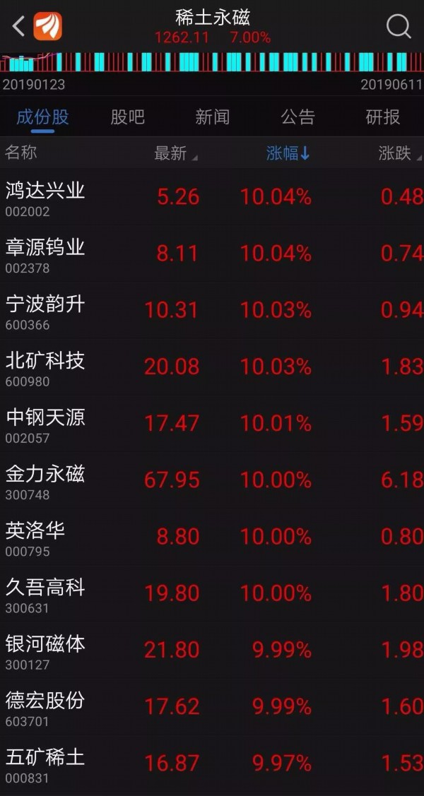 6月11日,稀土永磁板块大涨7%,板块指数创近期新高。五矿稀土、金力永磁、宁波韵升等13只稀土永磁股涨停。