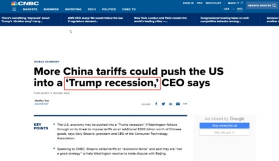 如果再对中国产品征收更多关税,会让美国经济陷入衰退!美国CNBC网站刚刚说,美国消费者技术协会CEO加里·夏皮罗在上海发出上述警告,并且他使用了一个新词——“特朗普衰退(Trump recession)”。