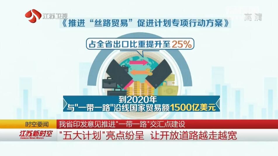 在贸易和人文交流方面,五大方案也有不少亮点。 比如在"推进丝路贸易促进计划专项行动"中,提出通过用 足用好自贸协定、发展丝路电商、优化整合中欧班列等一系 列举措,到 2020年与"一带一路"沿线国家贸易额占全省出口比重提升至25%。在人文交流方面,专项行动方案则提出打造"留学 江苏"教育品牌、"精彩江苏"文化品牌、"赛事江苏"体 育品牌等,营造一个良好的人文环境。