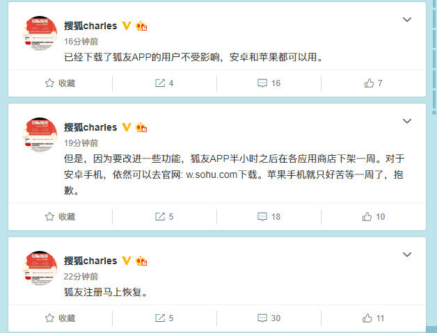 搜狐CEO张朝阳宣布,狐友APP半小时之后在各应用商店下架一周。张朝阳还表示,已经下载狐友APP的用户不受影响。