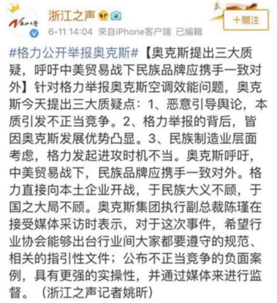 据浙江电台浙江之声官方微博@浙江之声 6月11日消息,针对格力举报奥克斯空调效能问题,奥克斯提出三大质疑点。首先,奥克斯指责格力恶意引导舆论,本质引发不正当竞争。其次,奥克斯分析称,格力举报的背后,皆因奥克斯发展优势凸显。最后,奥斯克认为,从民族制造业层面考虑,格力发起进攻时机不当。奥克斯因此呼吁,目前中美贸易摩擦下,“民族品牌应携手一致对外。格力直接向本土企业开战,于民族大义不顾,于国之大局不顾。”