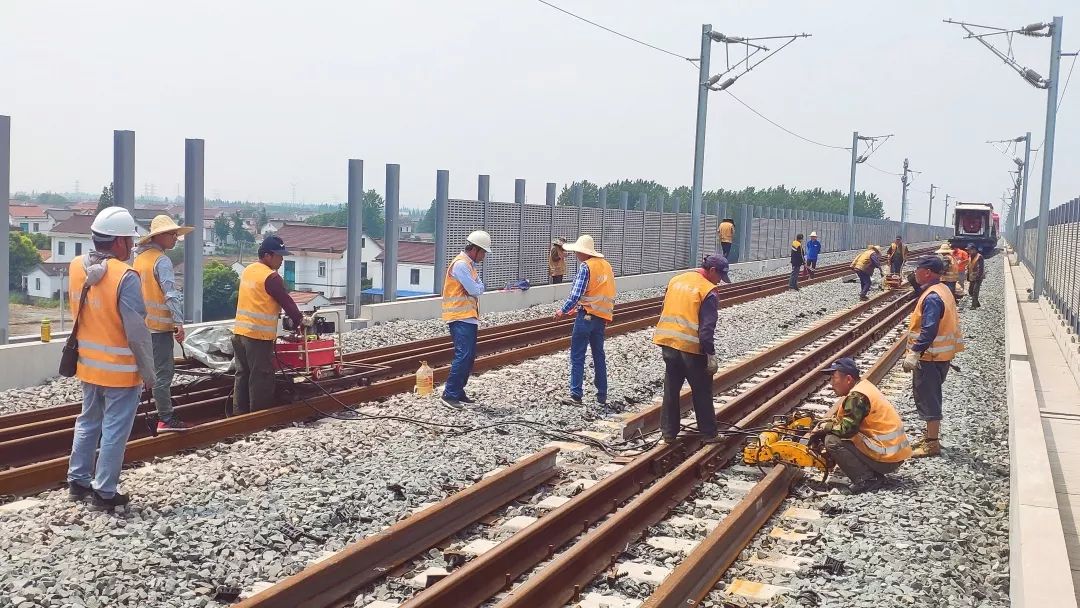 机械轰鸣,火星飞溅。今天上午,沪通铁路张家港北站向南2km处的铁轨上,一群工人正在进行长轨换铺及焊轨施工,现场一片热火朝天的景象。