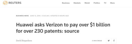 据路透社13日报道,有知情人士于周三透露,华为已要求美国通信公司Verizon支付230多项专利的逾10亿美元专利费。