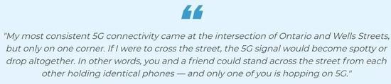 “我这边最稳定的5G连接是在安大略和威尔斯街的交叉口,但仅限一个街角。如果我过了马路,5G信号就会变得断断续续,甚至完全消失。换句话说,你和一个朋友可以拿着一模一样的手机站在街道两边,而你们中只有一个人能用上信号跳跃不稳的5G。”