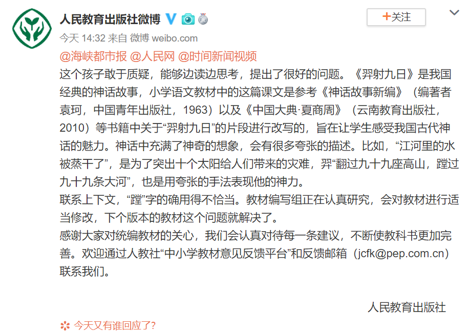 6月14日下午,就福州小学生质疑课文《羿射九日》表述不恰当一事,人民教育出版社在官方微博发表回应 。