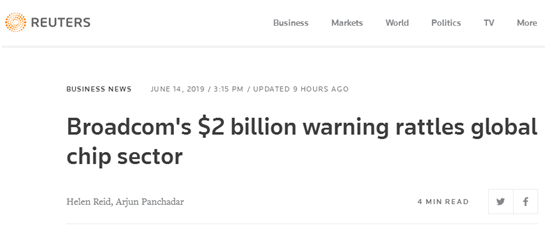 路透社在报道中说,此前,博通公司已将全年营收预估下调了20亿美元,并将此归因于中美贸易冲突和美国对华为实施的出口限制。
