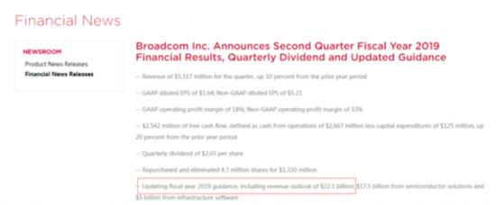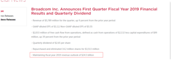 当地时间13日,博通在公告中表示,将2019财年的营收预期下调至225亿美元。这一营收预期,相比3个月前预计的245亿美元下降了8%,减少约20亿美元。