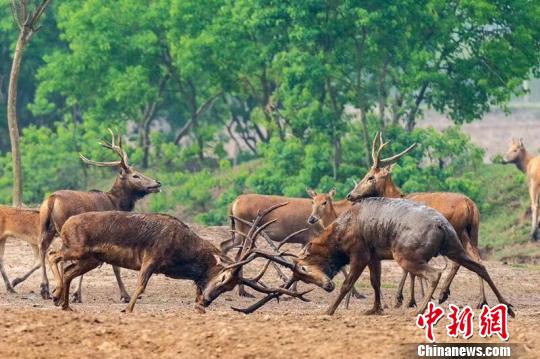 中新网南京6月15日电(记者 谷华)15日,在盐城境内的黄海滩涂湿地上,一头头蓄积足够精神和体力的雄麋鹿,怀着“王者荣耀”的梦想,投身群内雄鹿间的“王位”争夺战,通过决斗胜出的“鹿王”,将获得独一无二的交配权。
