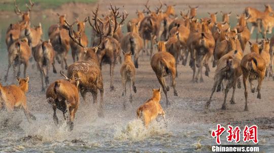成群的麋鹿正在滩涂上奔跑。麋鹿保护区供图