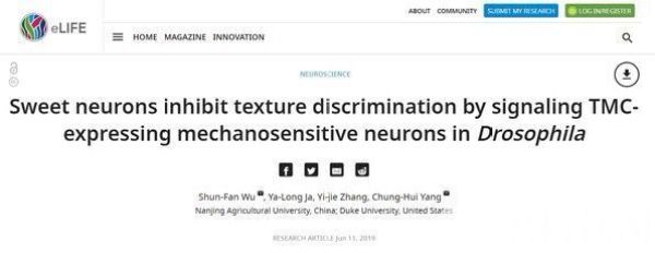 该研究“Sweet neurons inhibit texture discrimination by signaling TMC-expressing mechanosensitive neurons in Drosophila”于2019年6月11日以长文形式出版在eLIFE杂志上。吴顺凡博士是论文的第一作者和共同通讯作者,杜克大学YangChung-Hui博士是论文的共同通讯作者,植保院硕士生贾亚龙和博士生张伊杰也参与了部分工作,南京农业大学为论文第一研究单位。研究得到国家留学基金委,国家自然科学基金(批准号:31772205和31830075)以及美国NIH基金(R01GM100027)的资助。