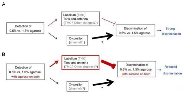 南京农业大学的一项研究发现,昆虫在产卵时能够区分产卵基质的硬度,而甜味感受影响昆虫产卵时的硬度区分。昆虫通过甜味受体感知产卵基质甜度,并进而激活甜味感知神经元。甜味感知神经元可进一步作用于硬度感知神经元,影响硬度感知神经元的信号输出。
