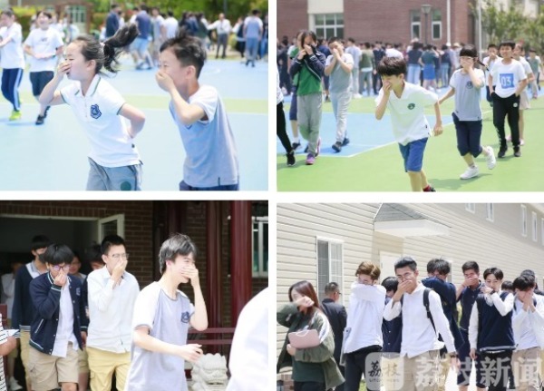 苏州工业园区外国语学校,是一所从幼儿园到高中15年一贯制学校,参加本次演练的,是小学到高中全体学生与教职员工。上午两节课后,小学部一年级的学生正在做眼保健操。