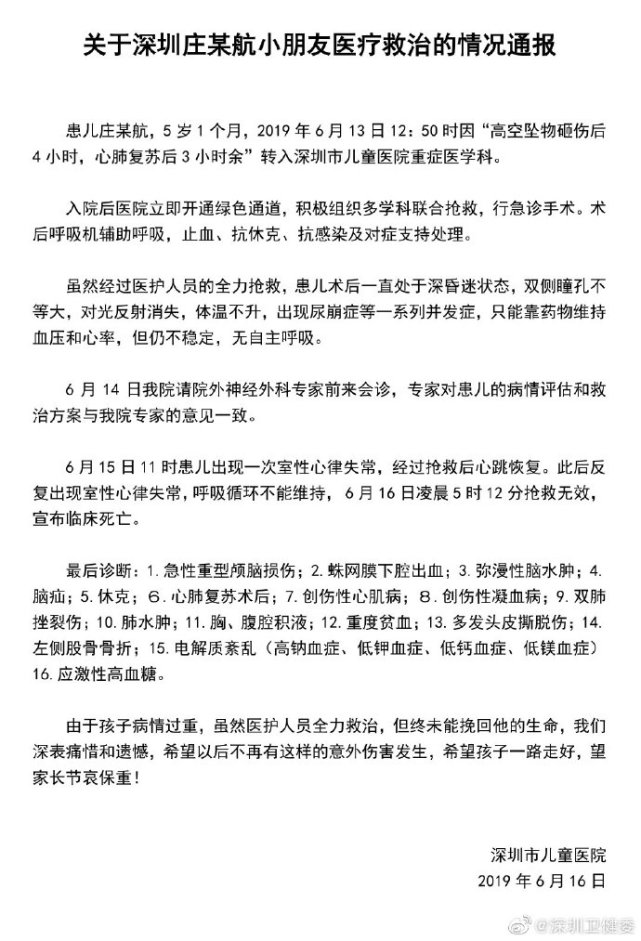 另据深圳儿童医院通报,患儿庄某航,5岁1个月,2019年6月13日12:50时因“高空坠物砸伤后4小时,心肺复苏后3小时余”转入深圳市儿童医院重症医学科。